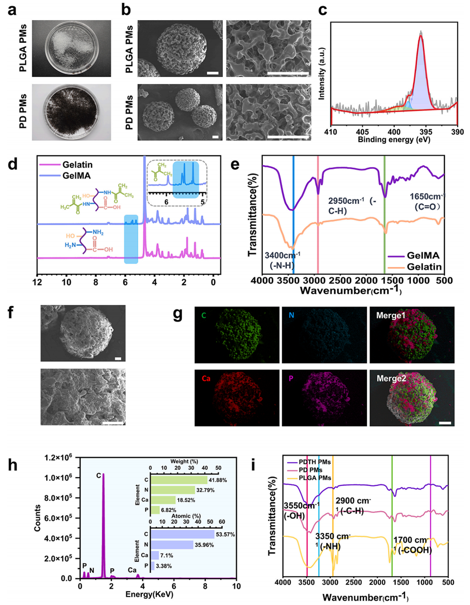 图3. PD PMs与PDTH PMs的制备与表征。a)PLGA PMs与PD PMs的宏观光学照片;b)PLGA PMs与PD PMs的SEM形貌图像(比例尺=100 μm);c)PD PMs的XPS表征结果;d)GelMA与明胶的¹H NMR分析;e)GelMA与明胶的FTIR分析;f)PDTH PMs的SEM形貌图像(比例尺=50 μm);g)PDTH PMs的EDX映射(主要含碳(C)、氮(N)、钙(Ca)、磷(P),比例尺=100 μm);h)PDTH PMs的半定量分析(显示各元素相对浓度比);i)PLGA PMs、PD PMs与PDTH PMs的FTIR分析。