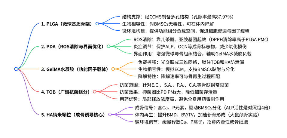 本研究的核心是“多功能集成”,但多组分(抗氧化、抗菌、成骨)的释放动力学可能并不一致。例如,妥布霉素(TOB)的快速释放可能需要在早期迅速抑制感染,而羟基磷灰石(HA)的长期缓慢释放则用于支持持续的成骨分化。这种不同步性如果设计得当,反而可以模拟骨修复的自然过程:先抗炎抗菌(早期),再促进成骨(中后期)。