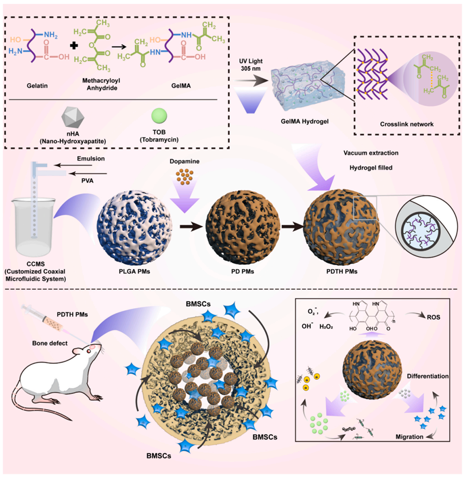 图1. PDTH PMs的制备及应用示意图。通过定制同轴微流控系统(CCMS)制备PLGA PMs,对其进行聚多巴胺(PDA)功能化修饰以赋予抗氧化活性,并负载含妥布霉素(TOB)和羟基磷灰石(HA)纳米颗粒的GelMA水凝胶,从而实现抗菌和促成骨效果。将PDTH PMs注射到大鼠颅骨缺损处,以在体内评估其骨再生效果。