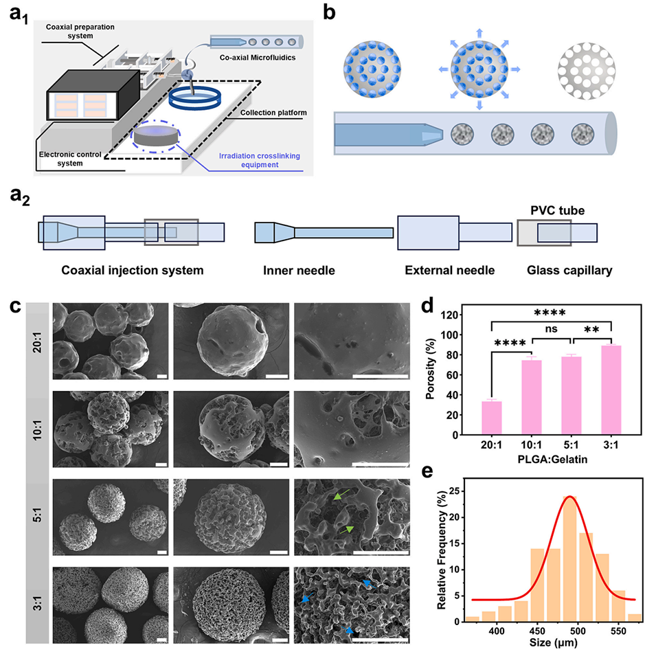 图2. PLGA PMs的制备与表征。a1)CCMS的结构示意图;a2)微流控注射系统的横截面示意图;b)利用CCMS制备PLGA PMs的过程;c)不同PLGA与明胶比例下PLGA PMs的SEM图像及形貌(比例尺=100 μm);d)不同PLGA与明胶比例下PLGA PMs的孔隙率;e)PLGA与明胶比例为3:1时PLGA PMs的粒径分布。