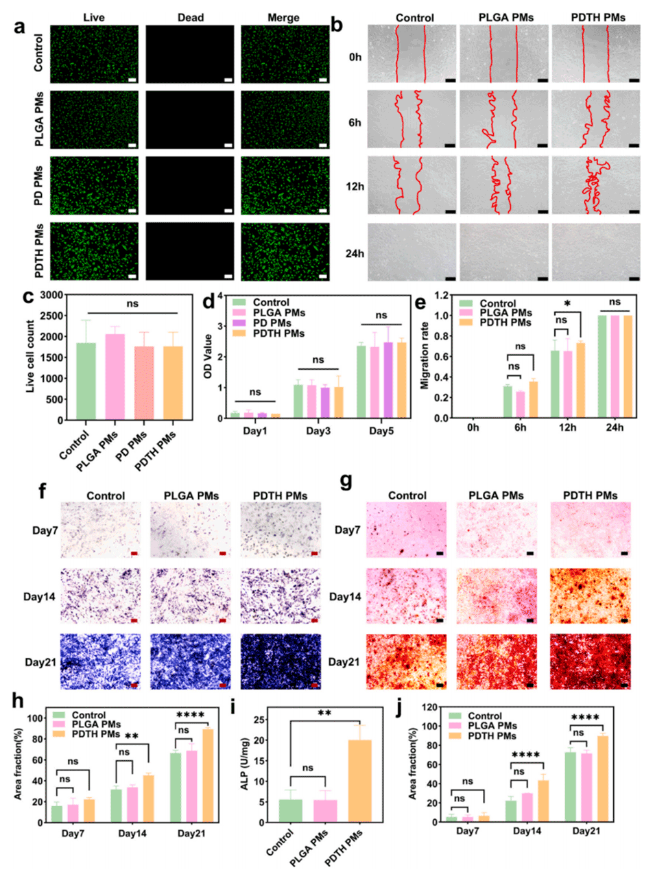 图5. 微球的生物相容性及体外促成骨诱导能力表征。a)通过Live/Dead染色实验观察PLGA PMs、PD PMs、PDTH PMs对骨髓间充质干细胞(BMSCs)的细胞毒性(绿色:钙黄绿素-AM染色活细胞,红色:碘化丙啶(PI)染色凋亡细胞,比例尺=200μm);b)不同材料培养下细胞迁移能力的划痕实验图像(比例尺=200μm);c)图5a中Live/Dead染色结果的定量分析;d)CCK-8法检测BMSCs与微球共培养1、3、5天后的增殖与活力;e)图5b中细胞迁移率的定量分析;f)BMSCs成骨分化培养后的碱性磷酸酶(ALP)染色结果(比例尺=200μm);g)BMSCs成骨分化培养后的茜素红(ARS)染色结果(比例尺=200μm);h)ALP染色面积的定量分析;i)通过ALP检测试剂盒对ALP活性的定量分析;j)ARS染色面积的定量分析。