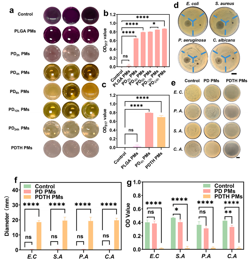 图4. 微球的ROS清除能力与抗菌性能。a-c)DPPH ROS清除实验(以PLGA PMs和PDTH PMs为对照组,同时设置不同多巴胺(DA)修饰时间的对照组);d)PD PMs与PDTH PMs的抑菌圈实验(比例尺=20 mm);e)PD PMs与PDTH PMs处理大肠杆菌(E.C.)、铜绿假单胞菌(P.A.)、金黄色葡萄球菌(S.A.)、白色念珠菌(C.A.)后的涂布平板结果(比例尺=20 mm);f)抑菌圈实验的定量分析;g)涂布平板实验的定量分析。