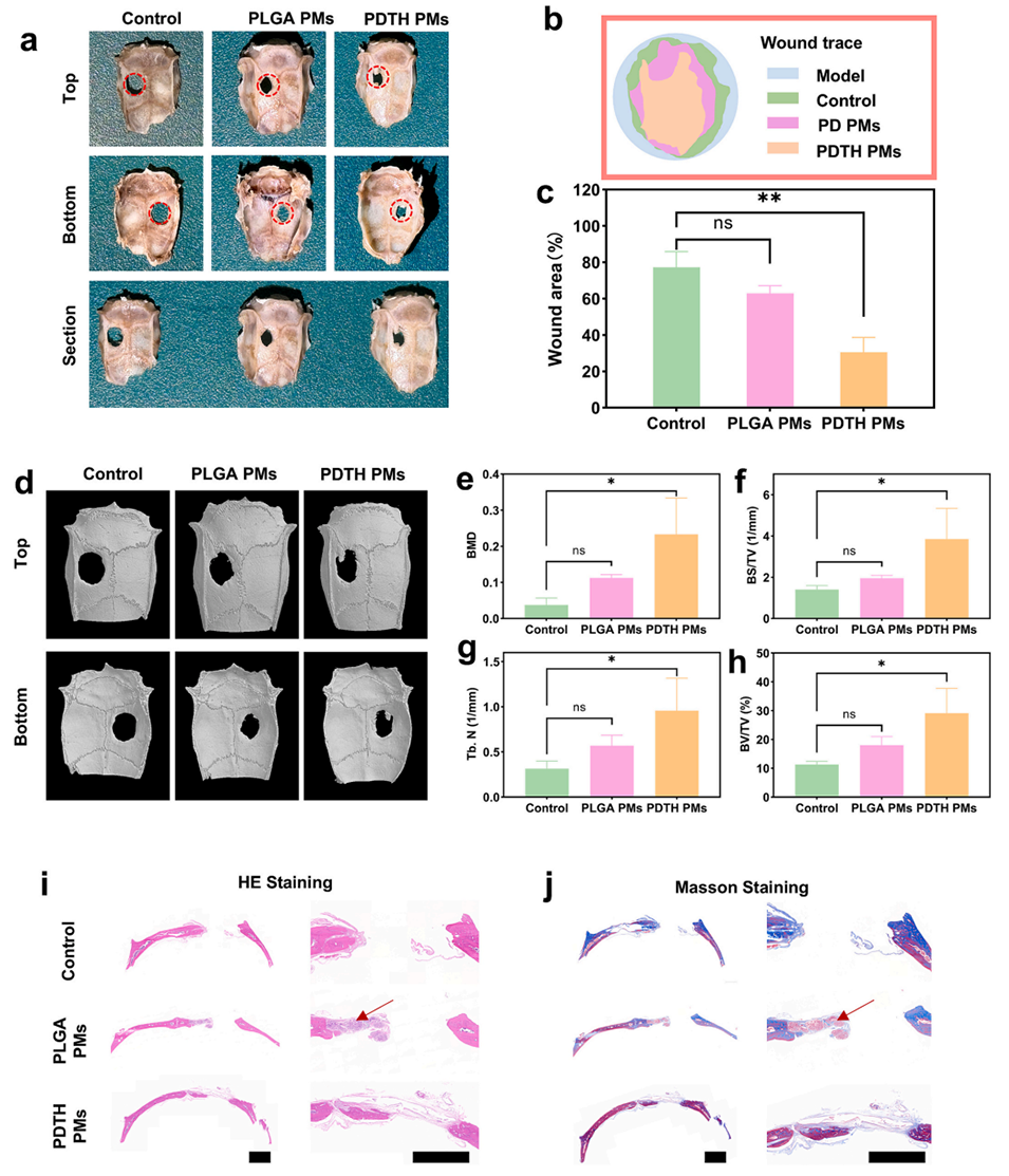 图6. PDTH PMs在体内的促成骨效果。a)不同微球处理6周后大鼠颅骨缺损的宏观图像;b)不同处理后颅骨缺损的轮廓追踪图;c)6周后各实验组的颅骨缺损面积;d)术后6周不同微球处理组大鼠颅骨缺损的Micro-CT三维重建图像;e-h)不同微球处理组缺损部位的骨矿物质密度(BMD)、骨体积/组织体积(BV/TV)、骨表面积/组织体积(BS/TV)及骨小梁数量(Tb.N);i-j)各实验组的HE染色与Masson三色染色结果(比例尺=2mm)。
