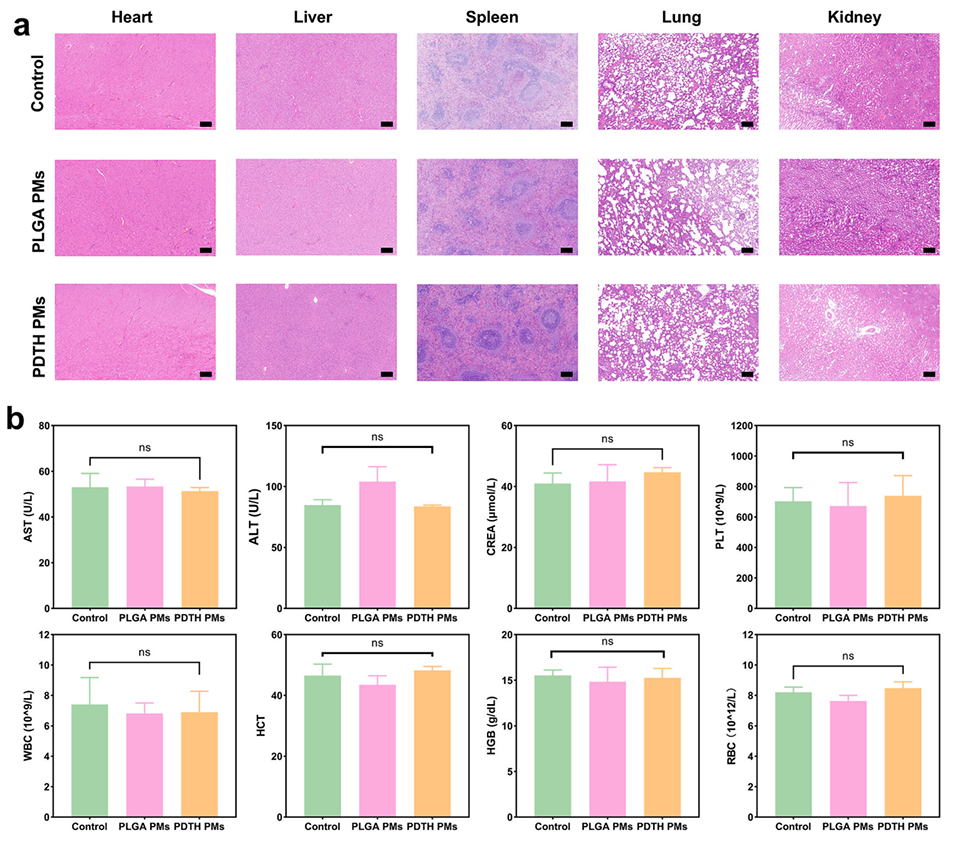 图7. PLGA PMs与PDTH PMs的体内生物安全性实验。a)注射微球6周后大鼠主要器官(心、肝、脾、肺、肾)的HE染色结果(比例尺=200μm);b)各实验组大鼠的血液生化指标分析(n=3)。