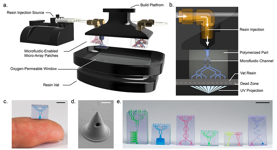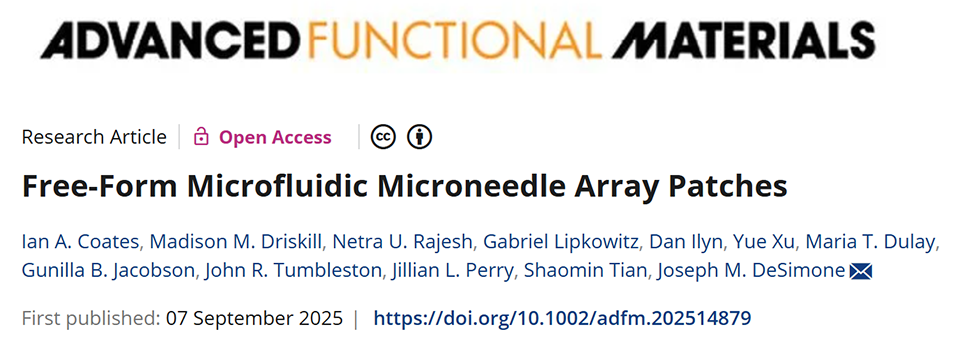 近期,斯坦福大学Joseph M. DeSimone教授团队开发了一种基于注射连续液体界面生产(iCLIP)技术的新型微流控微针贴片(MAP)。该贴片实现了复杂微流道与空心微针的一体化成型,支持多种载荷形式的透皮递送,包括液体药物共递送、原位混合及冻干制剂复溶,显著提升了给药能力和应用灵活性。相关研究以“Free-Form Microfluidic Microneedle Array Patches”为题发表于期刊《Advanced Functional Materials》。