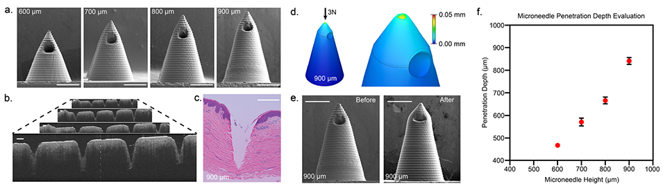 2、采用注射连续液体界面生产(iCLIP)这一增材制造技术,成功制备出高精度、可重复几何结构的复合微流体MAPs。其微针设计有侧开口孔,能降低插入时堵塞风险,保障透皮流体稳定递送,且可通过调整微针高度(600-900μm)实现不同深度的靶向给药,经猪皮和有限元分析验证,微针具备良好的皮肤穿透性与机械完整性,插入时不易断裂。