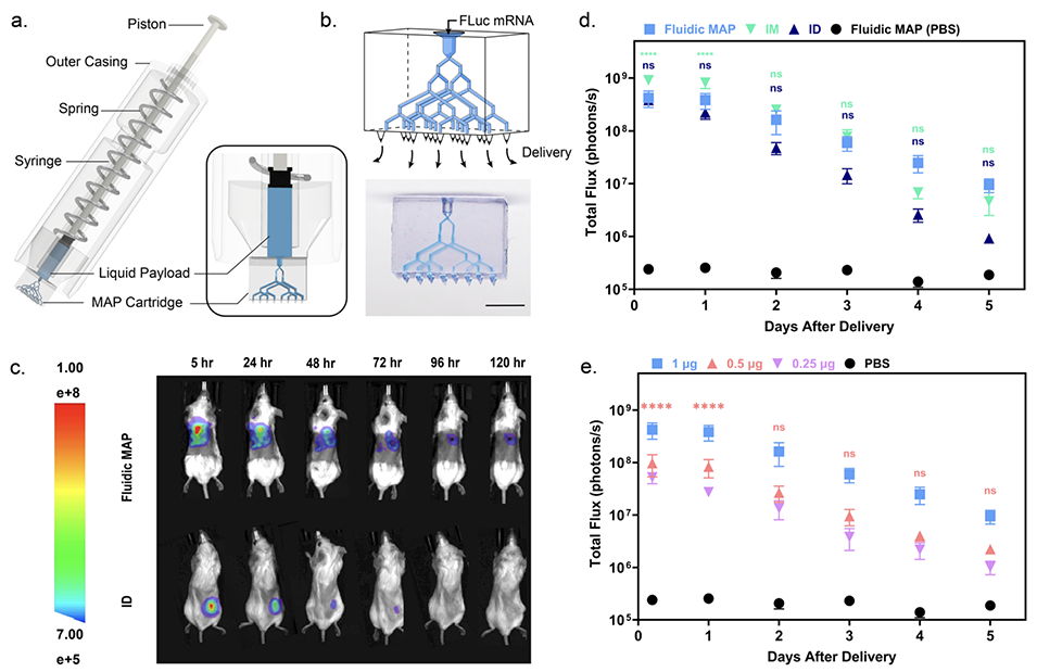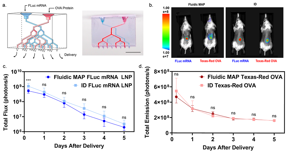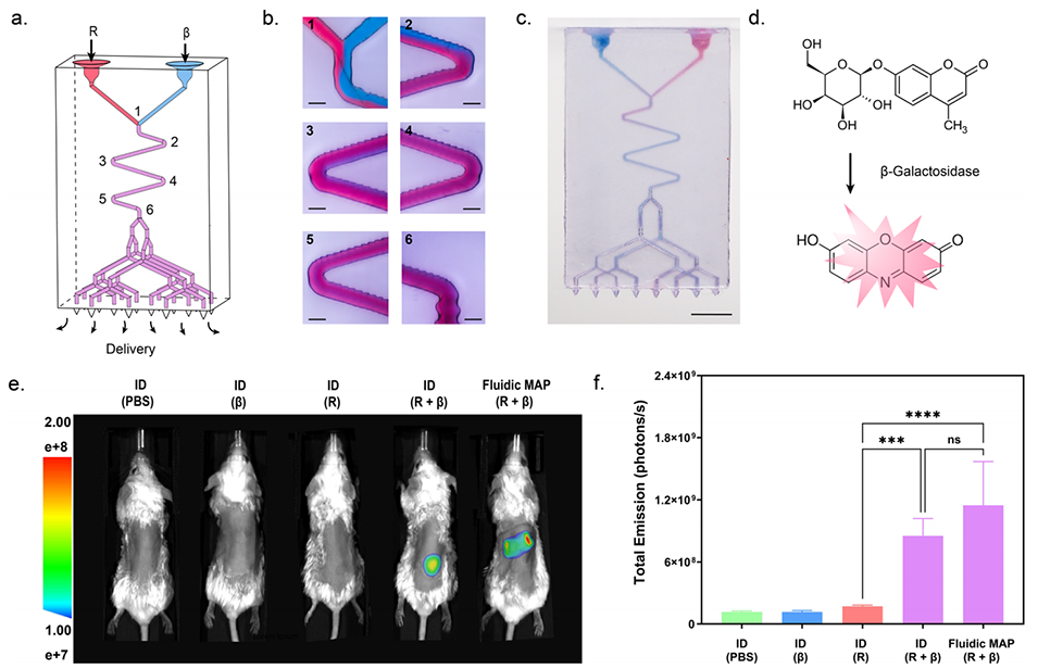 3、在功能验证方面,该微流体MAPs展现出出色的递送多样性:在小鼠体内实验中,能快速、精准递送液体载荷(如荧光素酶mRNA脂质纳米颗粒),24小时内表达水平可与皮内、肌内注射媲美,且呈剂量依赖性;可通过双独立微流体网络同时递送两种不同载荷(如mRNA和荧光标记卵清蛋白),效果与皮内注射相当;借助微流体反应器,能在给药点实时混合两种试剂并发生化学反应(如产生荧光产物)后递送;还可在储库中冻干固体载荷(如卵清蛋白),使用时用缓冲液复溶后快速递送,初期荧光信号与皮内注射相近。