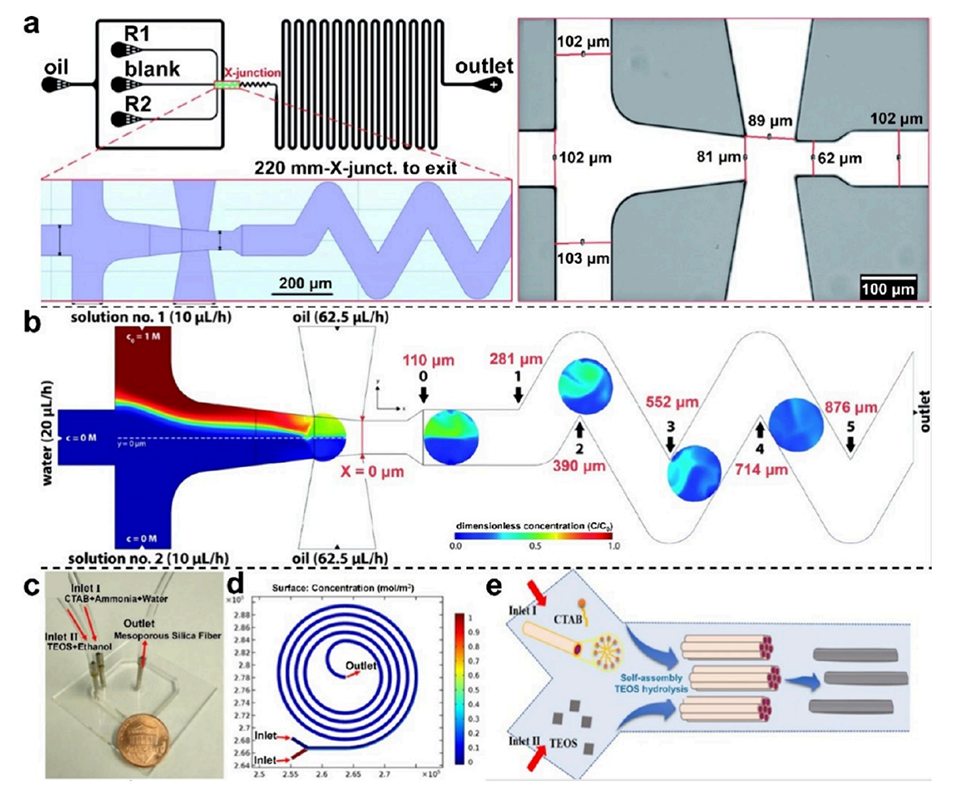 图 3(a)用于合成氧化铁纳米颗粒的微流控芯片及基于流动聚焦 X 型结的聚二甲基硅氧烷(PDMS)芯片明场图;(b)介孔二氧化硅纳米纤维微流控合成平台的模型分布;(c)介孔二氧化硅纳米纤维微流控合成平台的实验装置;(d)微流控螺旋通道内混合过程的 COMSOL 模拟结果;(e)介孔二氧化硅纤维形成过程示意图