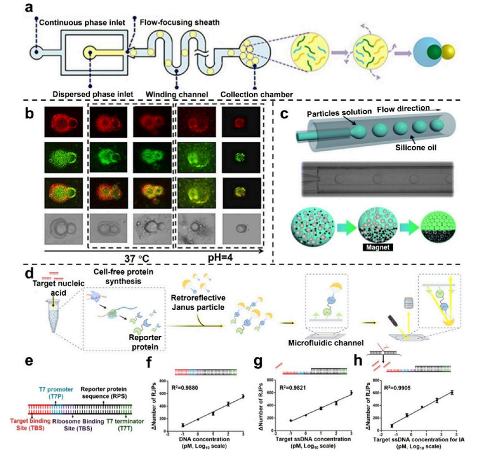 图 4(a)微流控制备三相 Janus 微粒示意图;(b)荧光显微镜下三相微粒中姜黄素(绿色)与阿霉素(DOX,红色)的分布及释放情况;(c)(上)共流微流控装置生成液滴模板的示意图与照片;(下)基于液滴模板制备 Janus 颗粒的过程示意图;(d)目标单链核酸检测方法原理;(e)用于无细胞蛋白合成(CFPS)反应的传感器 DNA 结构;(f)DNA 片段对数浓度与逆向反射信号的关系;(g)TASER 技术、(h)IA-TASER 技术中,单链 DNA 对数浓度与逆向反射 Janus 颗粒(RJP)数量变化值(Δ)的关系