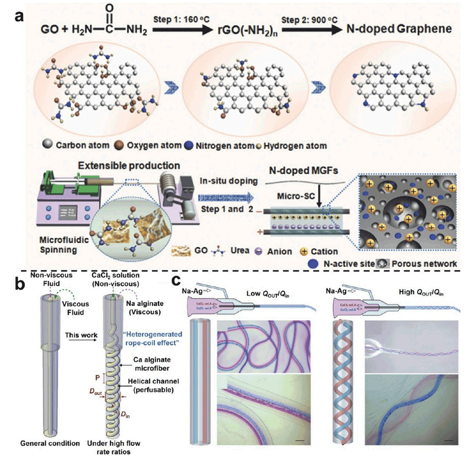 图 6(a)氮掺杂石墨烯及微流控导向石墨烯纤维的合成示意图;(b)内嵌螺旋通道微纤维的制备过程;(c)微流控内嵌 Janus 通道与双螺旋通道用于生成微纤维的示意图