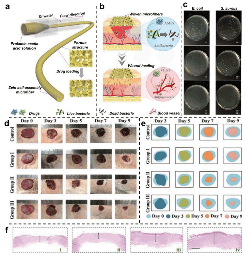 图 9(a)基于微流控纺丝技术制备的多孔水凝胶微纤维;(b)多孔水凝胶微纤维用于伤口愈合模型的示意图;(c)不同样品的抗菌实验:(i)磷酸盐缓冲液(PBS)、(ii)微纤维、(iii)载药微纤维;(d, e)四组实验中伤口在不同时间点的相对变化图像;(f)四组实验的苏木精-伊红(H&E)染色图像