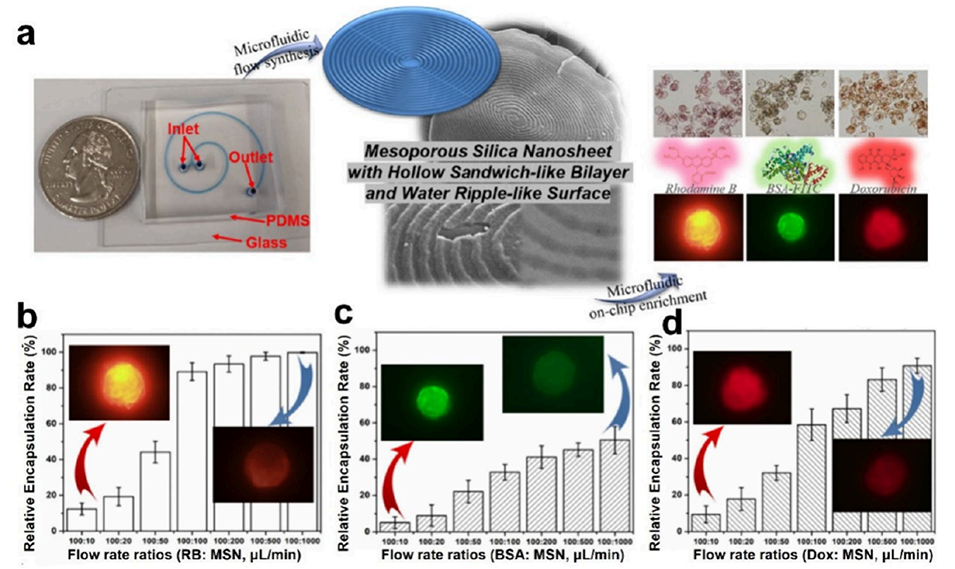 图 10(a)基于微流控的二维介孔二氧化硅纳米片合成与富集过程;(b)罗丹明 B(RB)、(c)牛血清白蛋白(BSA)、(d)阿霉素(Dox)三种物质在不同流速比下的介孔二氧化硅纳米片富集性能(基于函数模型)