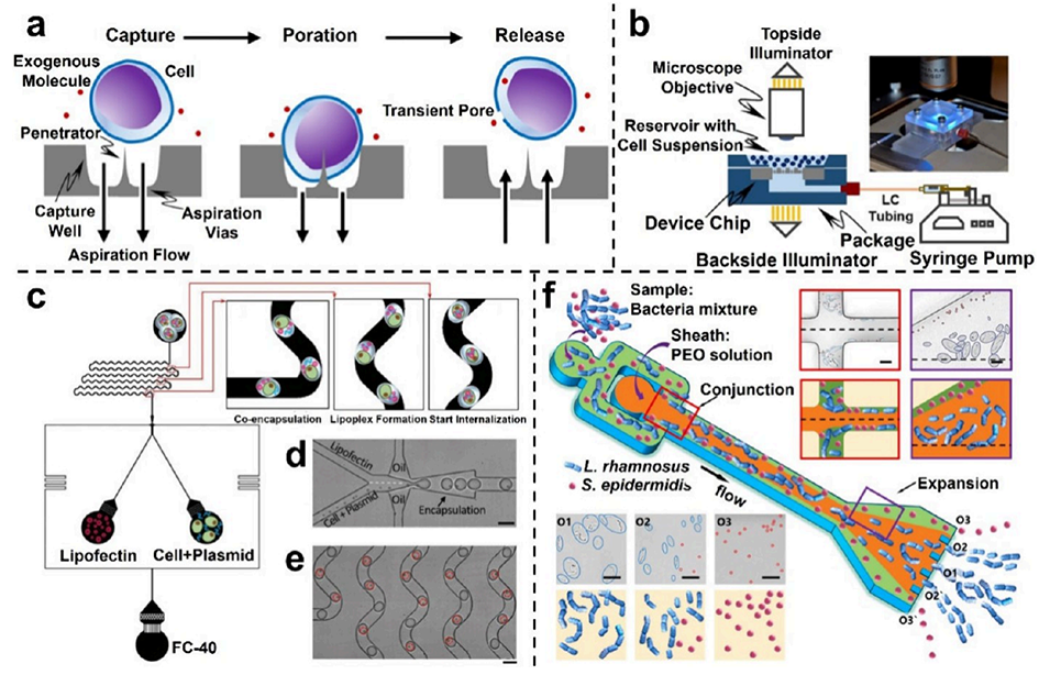 图 13(a)大规模细胞确定性机械穿孔(DMP)原理;(b)器件芯片封装示意图;(c)基于微流控的液滴单细胞脂质转染平台示意图;(d)基于微流控平台的液滴与细胞共包封过程;(e)微通道内液滴混沌对流的明场照片;(f)直微通道内鼠李糖乳杆菌(L. rhamnosus)与表皮葡萄球菌(S. epidermidis)的分离过程