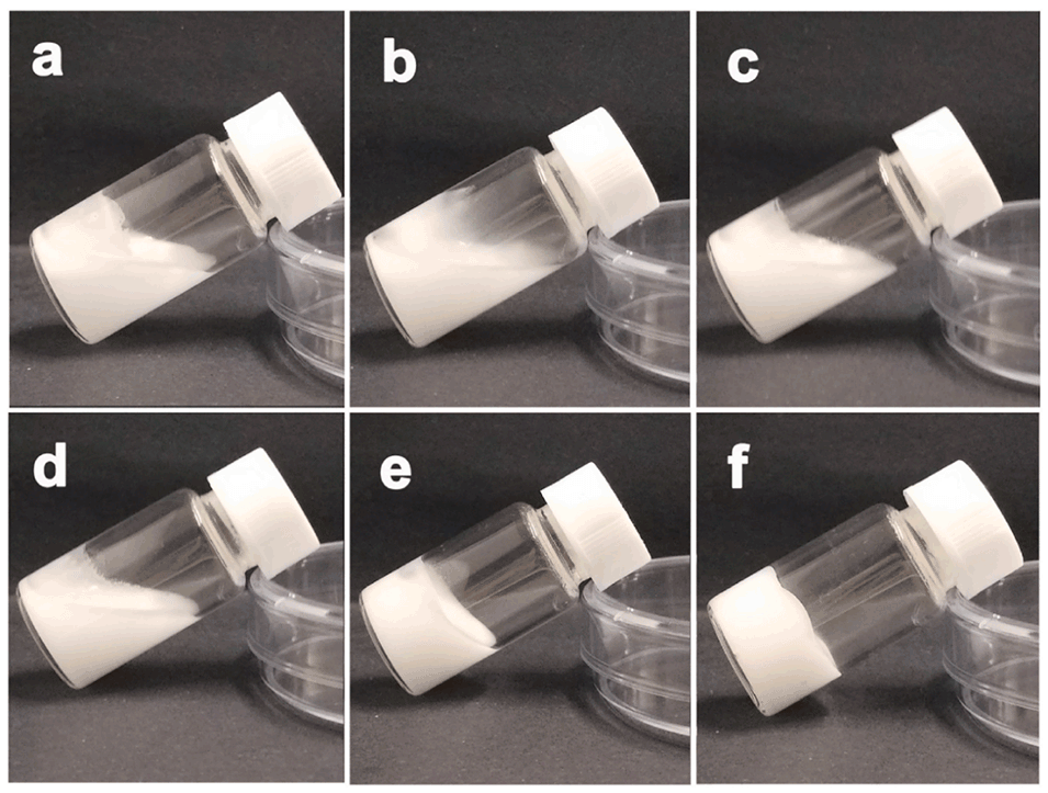 图2. 不同明胶含量的新鲜O/W乳液外观图。(a)0.5wt%、(b)1wt%、(c)1.5wt%、(d)2wt%、(e)2.5wt%、(f)3wt%。