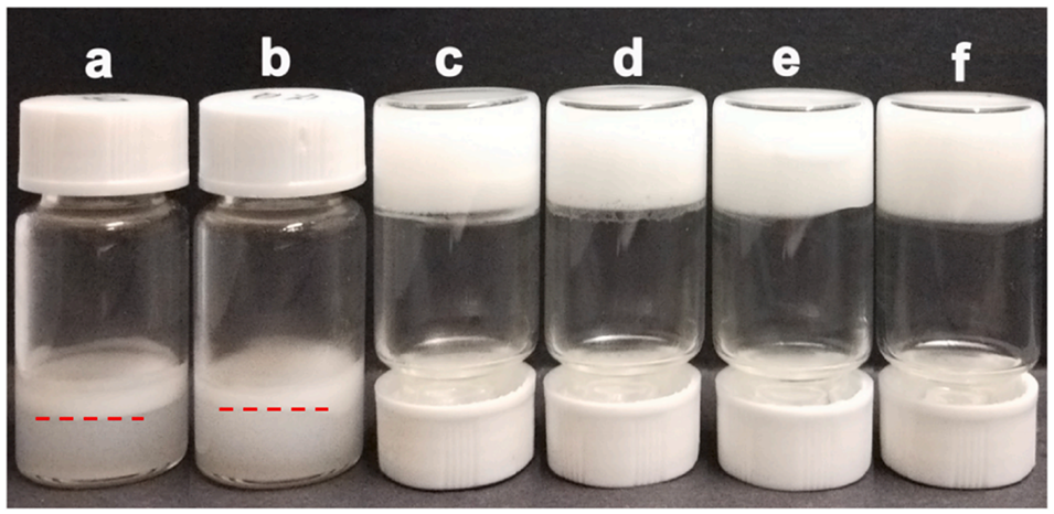 图3. 不同明胶含量的O/W乳液在室温下储存3天后的外观图。(a)0.5wt%、(b)1wt%、(c)1.5wt%、(d)2wt%、(e)2.5wt%、(f)3wt%。