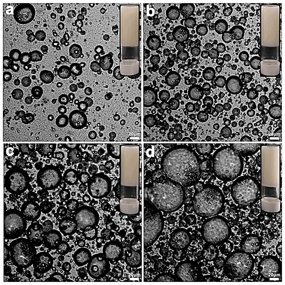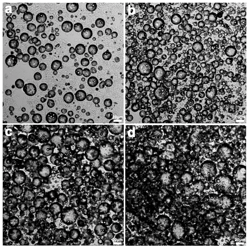 图5. 不同O/W乳液体积分数制备的O/W/O双乳液光学显微镜图。(a)10%(v/v)、(b)25%(v/v)、(c)40%(v/v)、(d)55%(v/v)。蜂蜡含量为6wt%。比例尺为20μm。