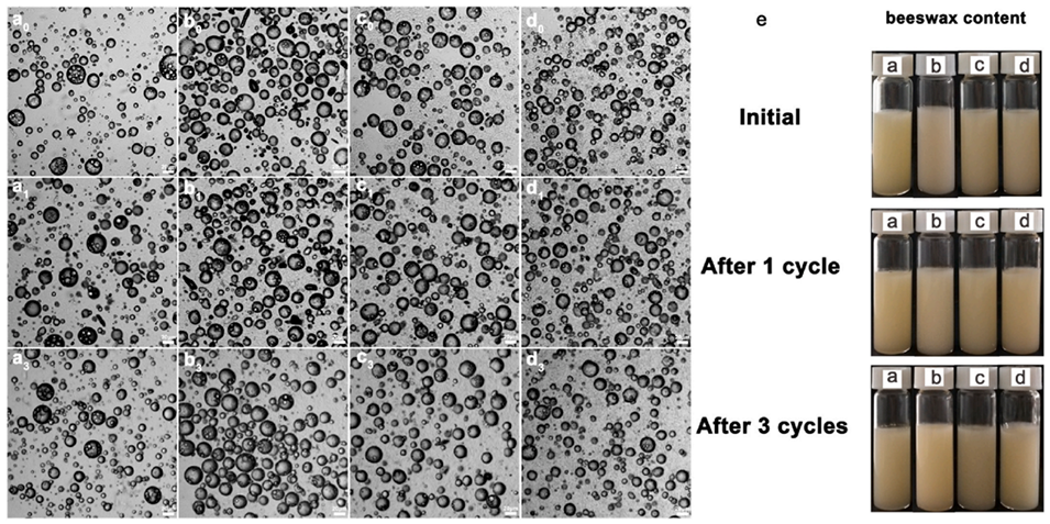 图11. 不同蜂蜡含量的O/W/O乳液在初始状态及经过3次冻融循环后的光学显微镜图像。(a)2wt%、(b)4wt%、(c)6wt%、(d)8wt%。(e)不同蜂蜡含量的O/W/O双乳液在初始阶段及经过3次冻融循环后的外观图。其中,明胶含量为3wt%的O/W乳液体积分数为10%(v/v)。下标(0–3)代表冻融循环次数。比例尺为20μm。