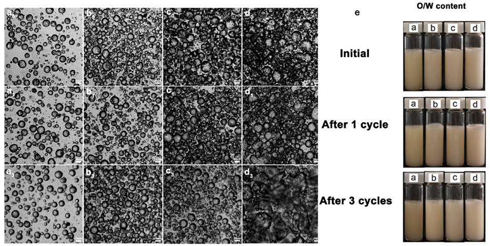 图12. 不同O/W乳液体积分数的O/W/O乳液在初始状态及经过3次冻融循环后的光学显微镜图像。(a)10%(v/v)、(b)25%(v/v)、(c)40%(v/v)、(d)55%(v/v)。(e)不同O/W乳液体积分数的O/W/O双乳液在初始阶段及经过3次冻融循环后的外观图。蜂蜡含量为6wt%。下标(0–3)代表冻融循环次数。比例尺为20μm。
