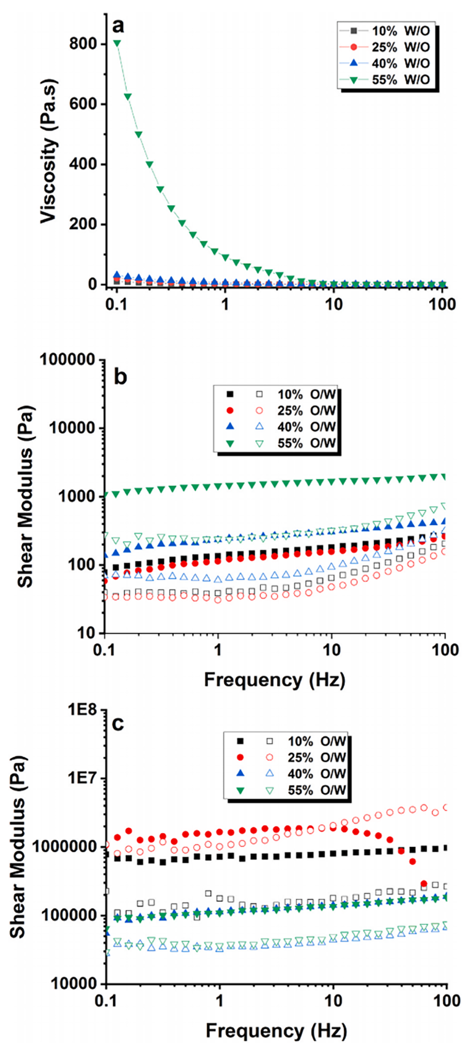 图14. 不同O/W乳液添加量稳定的O/W/O双乳液流变特性图。