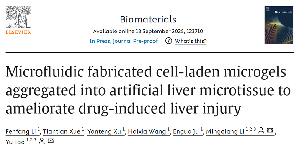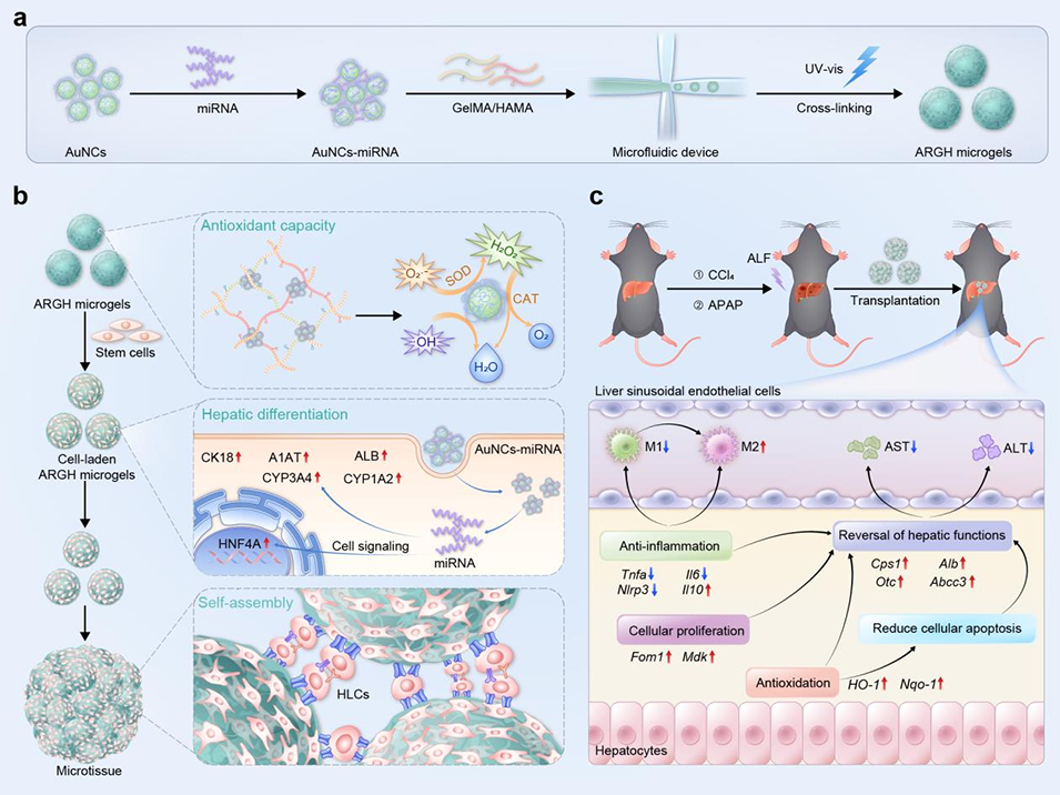 近期,中山大学附属第三医院纳米医学中心李明强研究员、陶玉研究员团队开发了一种基于微流控技术的一体化策略,成功制备出搭载金纳米簇-微小RNA功能单元的载干细胞微凝胶。这些微凝胶不仅可高效诱导干细胞肝向分化,还能自下而上组装成具有抗氧化、抗炎和促血管生成功能的人工肝微组织,在药物性肝损伤模型中展现出显著的治疗潜力。相关研究以“Microfluidic fabricated cell-laden microgels aggregated into artificial liver microtissue to ameliorate drug-induced liver injury”为题目,发表在期刊《Biomaterials》上。