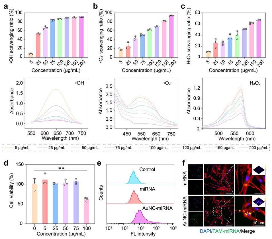 图2. 金纳米簇-微小RNA复合物(AuNCs-miRNA)的合成与表征。