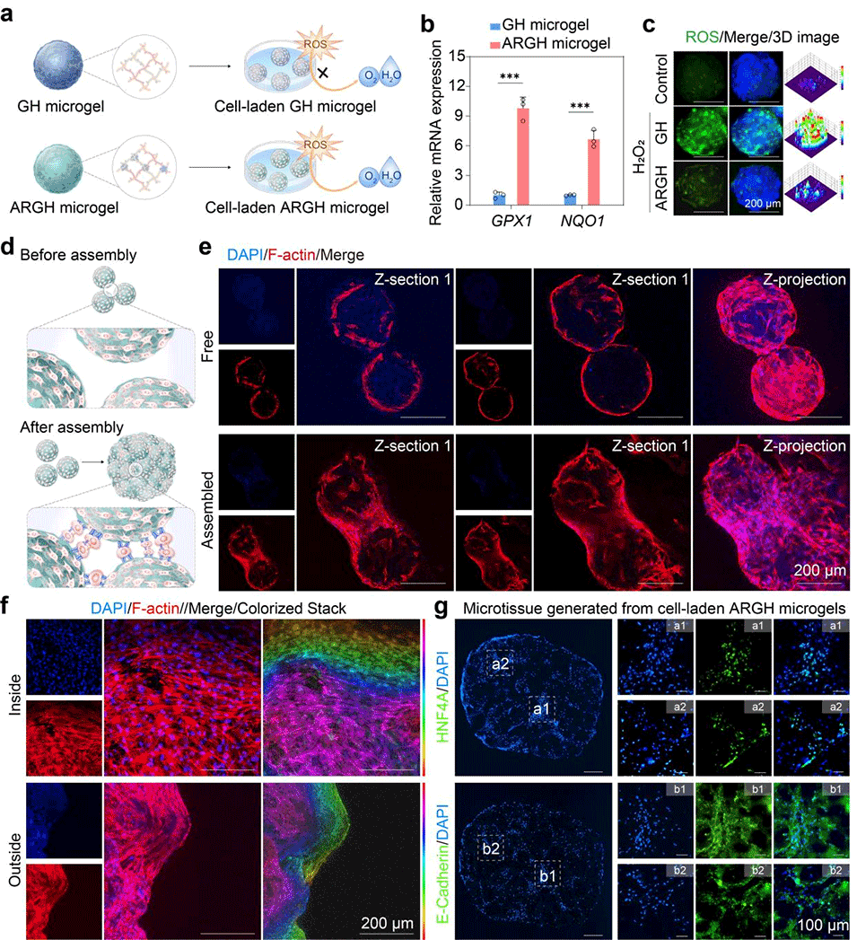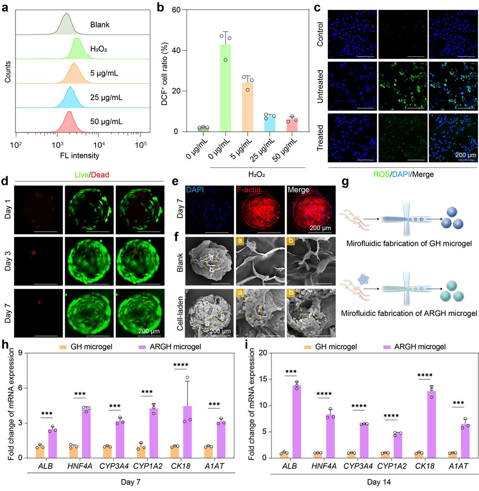 图3. ARGH微凝胶的表征及其在促进干细胞肝向分化中的作用。
