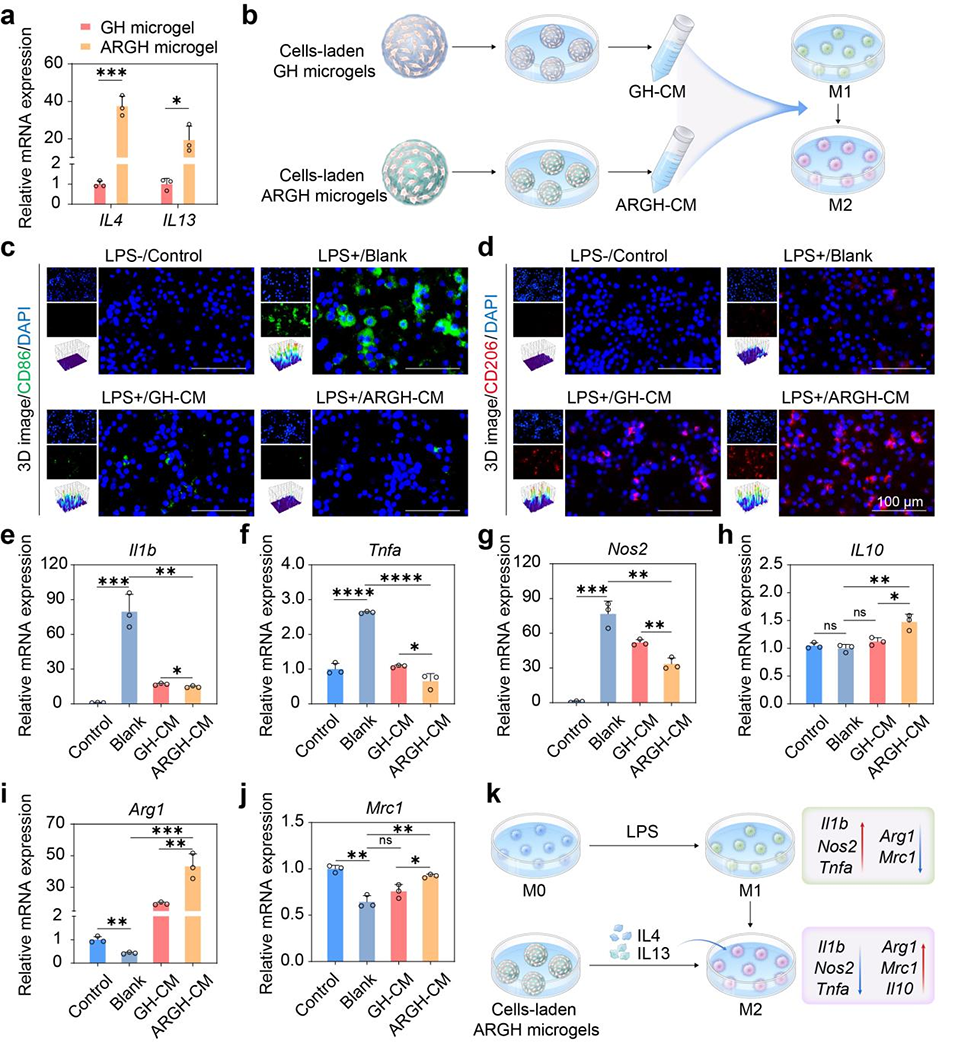 图4. 负载细胞的ARGH微凝胶对巨噬细胞极化的调控作用。