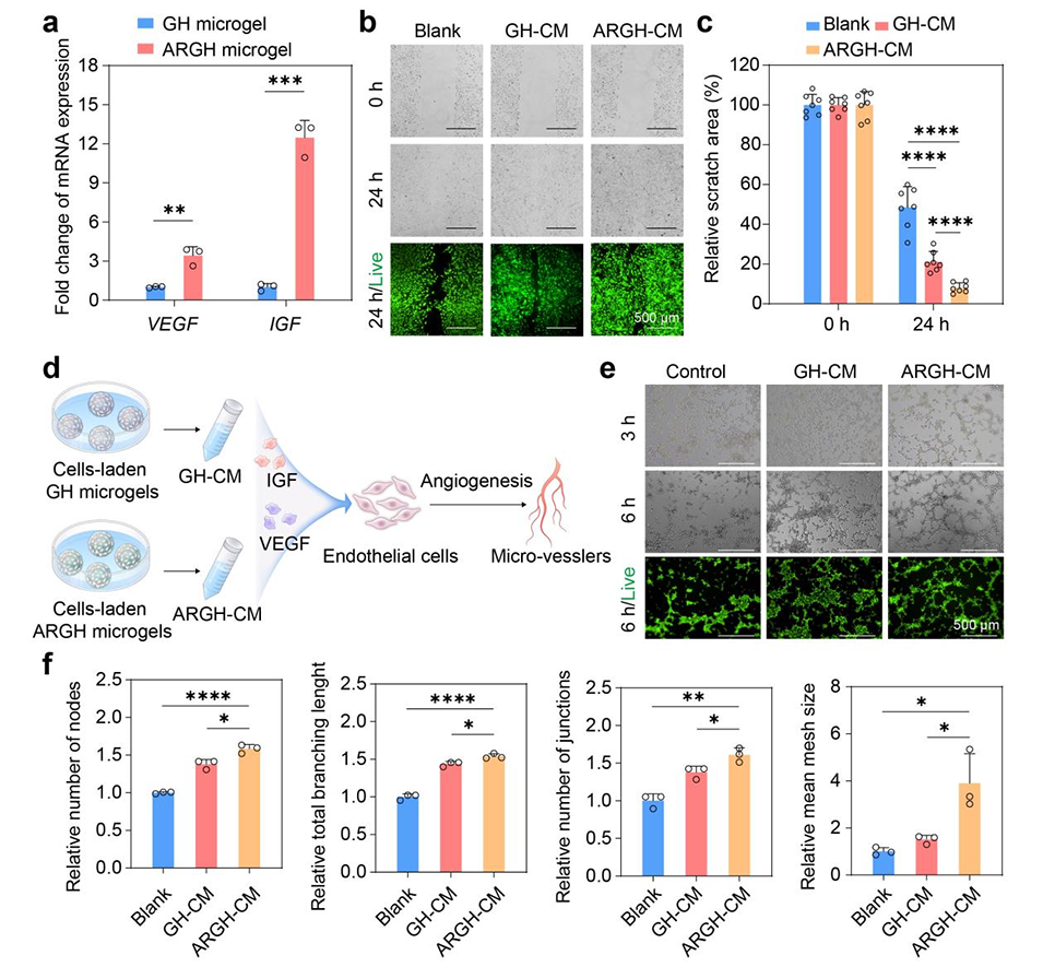 图5. 负载细胞的ARGH微凝胶促进细胞迁移与血管生成。