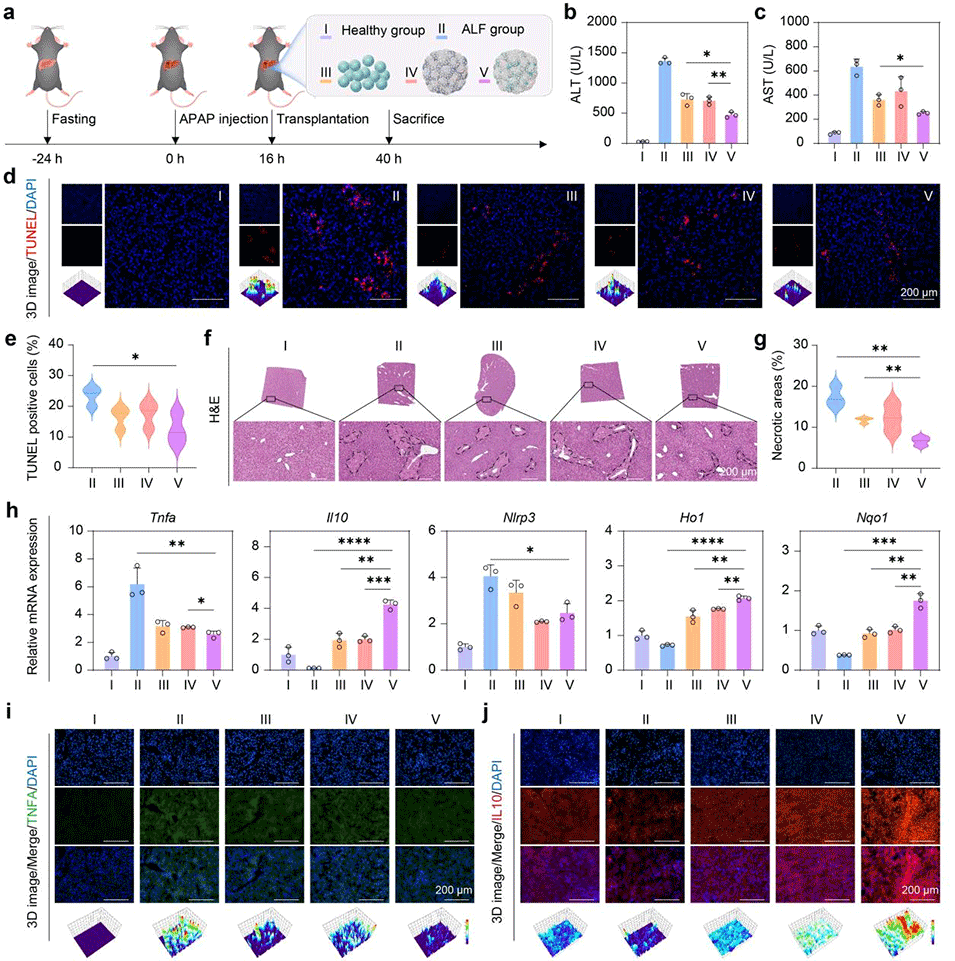 图7. 生物工程肝微组织在对乙酰氨基酚(APAP)诱导肝衰竭模型中的体内治疗效果。