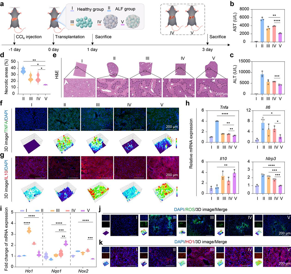 图8. 生物工程肝微组织在四氯化碳(CCl4)诱导肝衰竭模型中的体内治疗效果。