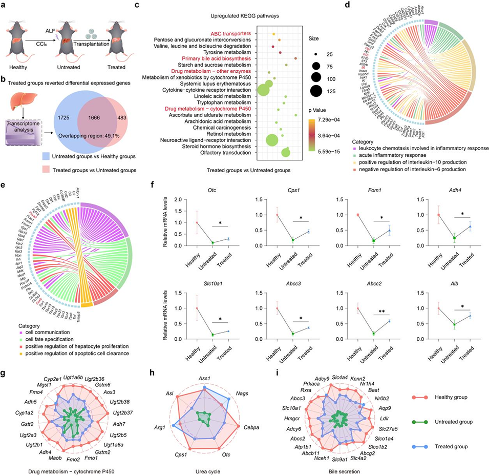 图9. 转录组测序分析揭示生物工程肝微组织在CCl4诱导肝衰竭模型中对肝功能的恢复作用。