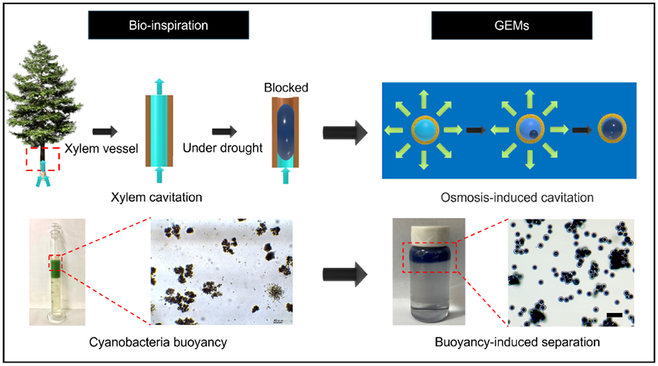 1、受自然界中水生微生物利用气囊调节浮力和植物在干旱胁迫下发生空化现象的启发,本研究开发了一种气体封装微胶囊(GEMs),并利用其产生的浮力来实现微胶囊的高效纯化。