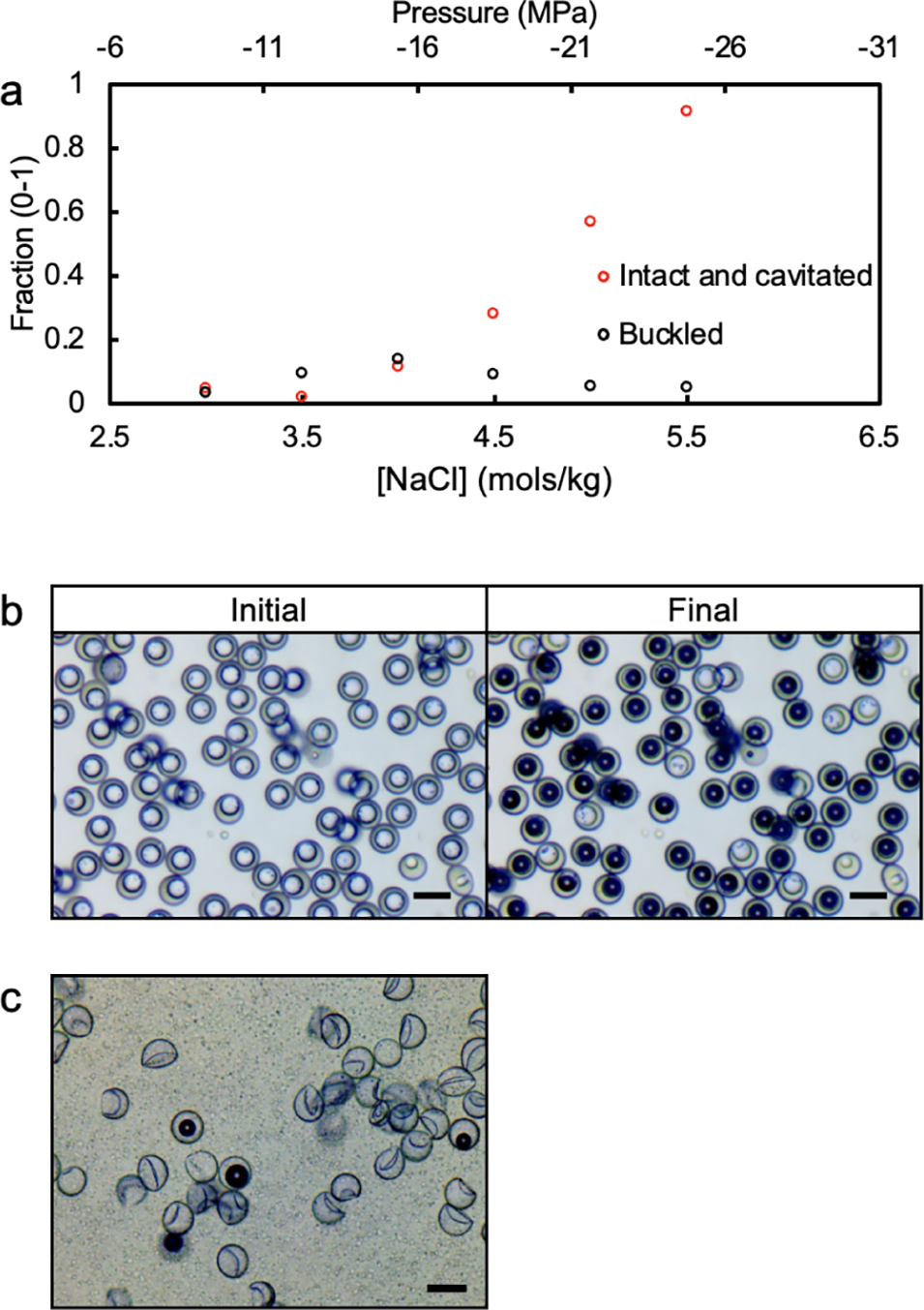 图2.(a)完整且发生空化的微胶囊(红色)与褶皱微胶囊(黑色)占比随盐浓度变化的关系图,未形成气泡的完整微胶囊占比未纳入此图;(b)壳厚直径比(t/D)为 0.21 的微胶囊,从氯化钠浓度 1.5 mol/kg 溶液转移至 5.5 mol/kg 溶液前、后 30 分钟的显微图像,比例尺为 20 μm;(c)因壳厚直径比(t/D)较小(0.04),大量 PLGA 微胶囊发生渗透诱导褶皱的显微图像,该图像拍摄于微胶囊从氯化钠浓度 1.5 mol/kg 溶液转移至 5.5 mol/kg 溶液后 3 分钟,背景中可见的细小碎屑为在 5.5 mol/kg 氯化钠浓度下析出的聚乙烯醇(PVA),比例尺为 30 μm。
