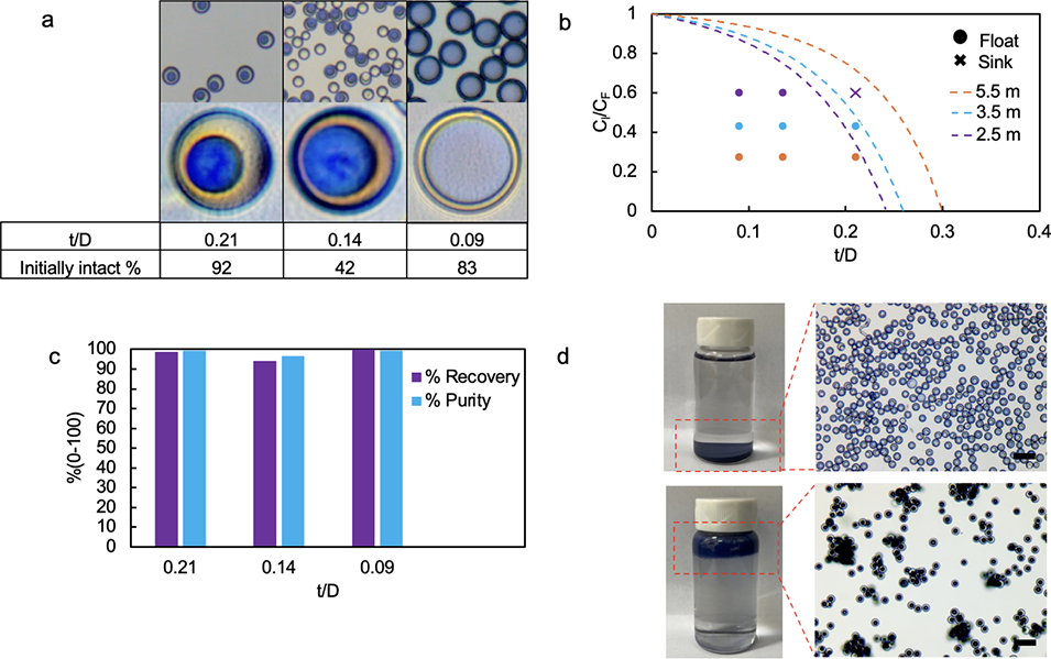 图4. 基于浮力的 GEM 分离。(a)用于表征浮力与分离效果的微胶囊,从左至右微胶囊尺寸分别为 13 μm、13 μm、15 μm;(b)使微胶囊产生浮力所需的气泡体积分数与壳厚直径比(t/D)的浓度比关系图,圆圈代表漂浮,叉号代表下沉,橙色、蓝色、紫色直线分别为氯化钠浓度 5.5 mol/kg、3.5 mol/kg、2.5 mol/kg 时对应的水密度操作线;(c)不同壳厚直径比(从左至右分别为 0.21、0.14、0.09,初始纯度分别为 92%、42%、83%)的微胶囊,其分离回收率(紫色)与纯度(蓝色)对比图;(d)完整微胶囊的批量分离效果,上图为微胶囊在氯化钠浓度 1.5 mol/kg 溶液中的初始状态,下图为在氯化钠浓度 5.5 mol/kg 溶液中分离后的状态,比例尺为 50 μm。