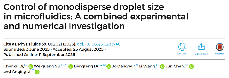 单分散液滴具有尺寸分布均一、理化性质可控的特点,已在药物递送、生物工程和食品科学领域得到广泛应用。然而,通过实验调控液滴尺寸通常需要多次设计光刻掩模并制作微流控芯片,成本高且效率低。为解决这一问题,齐鲁工业大学(山东省科学院)机械工程学院苏伟光副教授团队基于Fluent软件中的流体体积(VOF)方法,开发了一种微流控液滴生成数值模型。该模型通过实验验证,误差低于5.43%,系统揭示了结构与操作参数对液滴生成的影响机制,实现了液滴尺寸在13.6–108.55 μm范围内的精准调控。相关研究以“Control of monodisperse droplet size in microfluidics: A combined experimental and numerical investigation”为题目,发表在期刊《Physics of Fluids》上。