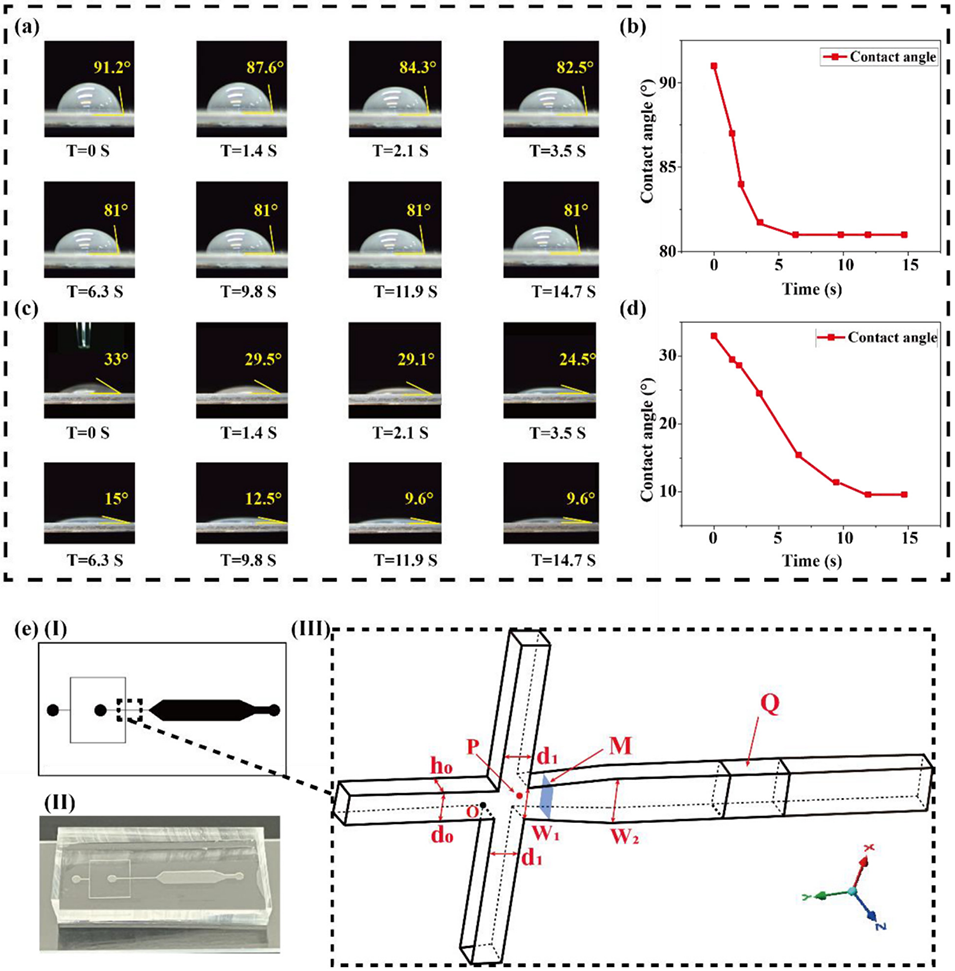 图1. 实验示意图。(a)连续相与聚二甲基硅氧烷(PDMS)接触角的时间分辨图像;(b)连续相与 PDMS 接触角的变化曲线;(c)连续相与改性后 PDMS 接触角的时间分辨图像;(d)连续相与改性后 PDMS 接触角的变化曲线;(e)微流控芯片示意图:Ⅰ. 芯片整体结构的二维示意图;Ⅱ. 微流控芯片实物图;Ⅲ. 液滴生成区域放大图,标注了关键几何参数、XZ 监测面 M(Y=-60 μm)、监测流体域 Q 及压力监测点 P。