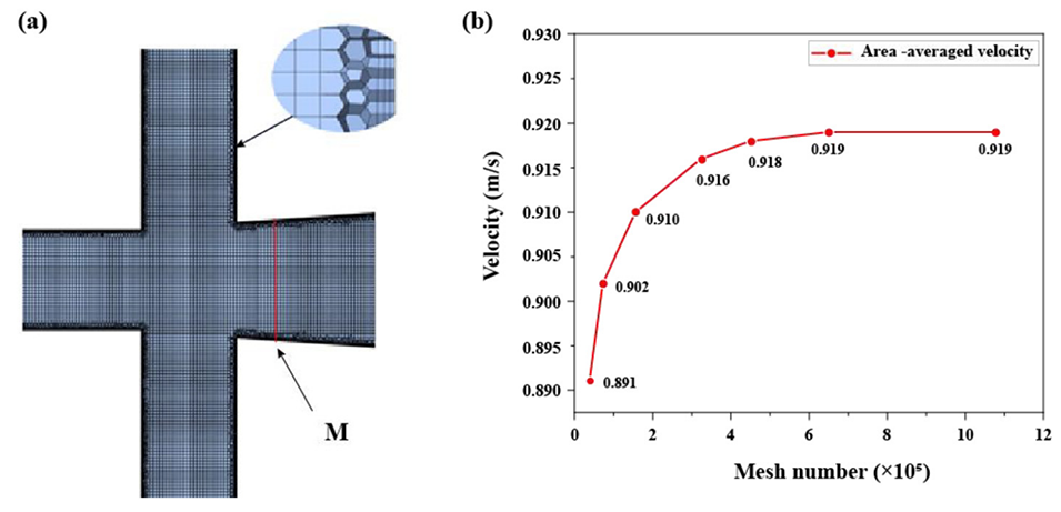 图2. 网格生成与独立性分析。(a)网格划分策略及边界层配置示意图,包含 XZ 监测面 M(Y=-60 μm);(b)网格独立性验证结果。