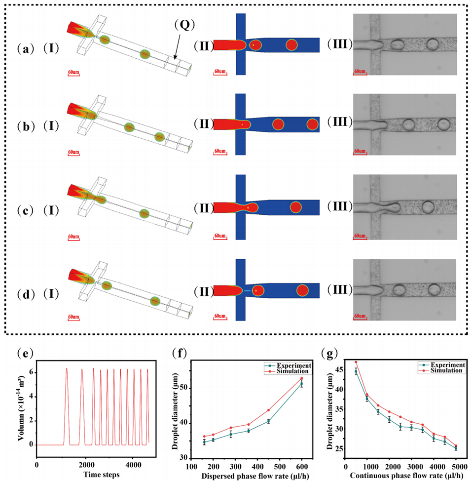 图3. 液滴生成过程的周期性演变(分散相流速:600 μL/h;连续相流速:1200 μL/h)。(a)滞后阶段;(b)填充阶段;(c)颈缩阶段;(d)分离阶段。每个虚线框包含以下内容:Ⅰ. 带监测流体域 Q(用于提取液滴体积瞬态曲线)的三维形态云图;Ⅱ. XY 平面横截面图;Ⅲ. 实验图像。(e)液滴体积随时间的瞬态变化曲线;(f)连续相流速固定为 1200 μL/h 时,不同分散相流速下的模拟结果与 Han 等人的实验数据对比;(g)连续相流速固定为 600 μL/h 时,不同分散相流速下的模拟结果与 Han 等人的实验数据对比。