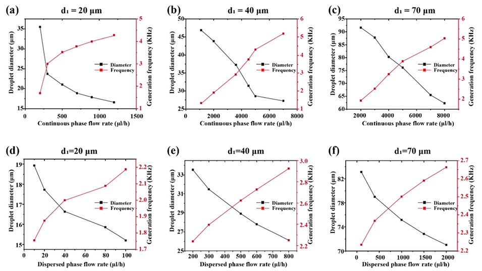 图10. 不同通道宽度(d1)下液滴生成频率与液滴尺寸的关系。(a-c)分散相流速分别为 40 μL/h、300 μL/h、400 μL/h 时的频率-尺寸关系;(d-f)连续相流速分别为 500 μL/h、3000 μL/h、6000 μL/h 时的频率-尺寸关系。