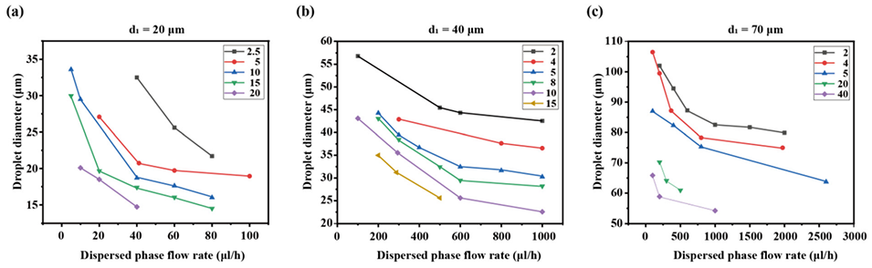 图11. 不同通道宽度(d1)下,固定流速比时分散相流速对液滴尺寸的影响。每条曲线代表一个不同的流速比:(a)d1=20 μm;(b)d1=40 μm;(c)d1=70 μm。