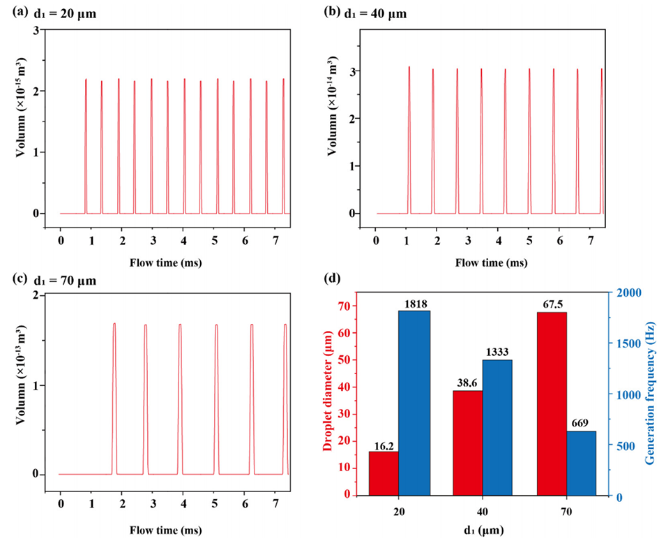 图9. 分散相流速固定为 0.0139 m/s、连续相流速固定为 0.3472 m/s 时,通道宽度 d1(20、40、70 μm)对液滴生成特征的影响。(a-c)液滴体积随时间的瞬态曲线;(d)不同通道宽度下的液滴尺寸与生成频率。