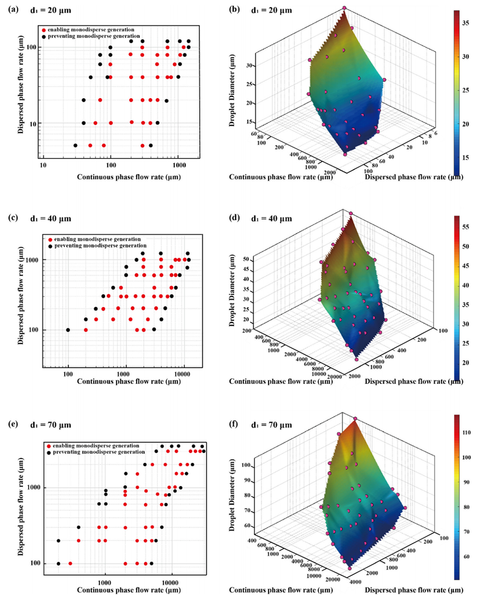 图4. 不同入口通道宽度(d1)下单分散液滴的生成状态。(a、c、e)液滴生成结果散点图:红点表示成功生成单分散液滴,黑点表示未能生成单分散液滴;(b、d、f)响应面图,展示液滴直径与连续相-分散相流速比的关系。