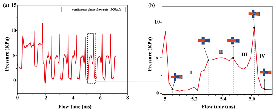 图5. 监测点 P 处的动态压力特征。(a)连续相流速为 1000 μL/h 时,监测点 P 的压力瞬态曲线;(b)液滴形成四个特征阶段(滞后、填充、颈缩、分离)的压力演变过程。