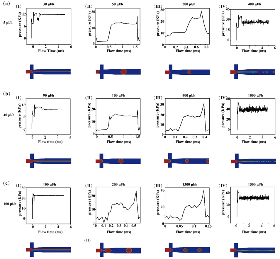 图6. d1=20 μm 时不同流动条件下的压力特征与液滴形态。(a-c)连续相流速对监测点 P 压力的影响,对应分散相流速分别为 5 μL/h、40 μL/h、100 μL/h。每个子图上方为监测点 P 的压力瞬态曲线,下方为对应操作条件下的液滴生成轮廓图。
