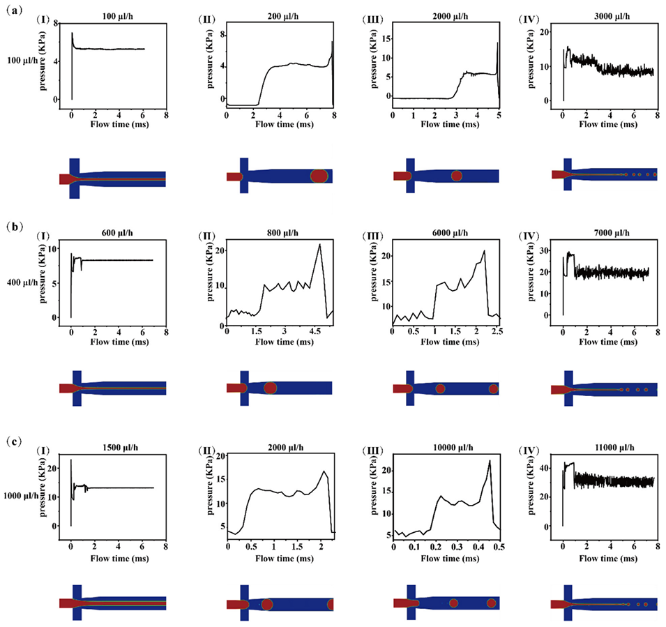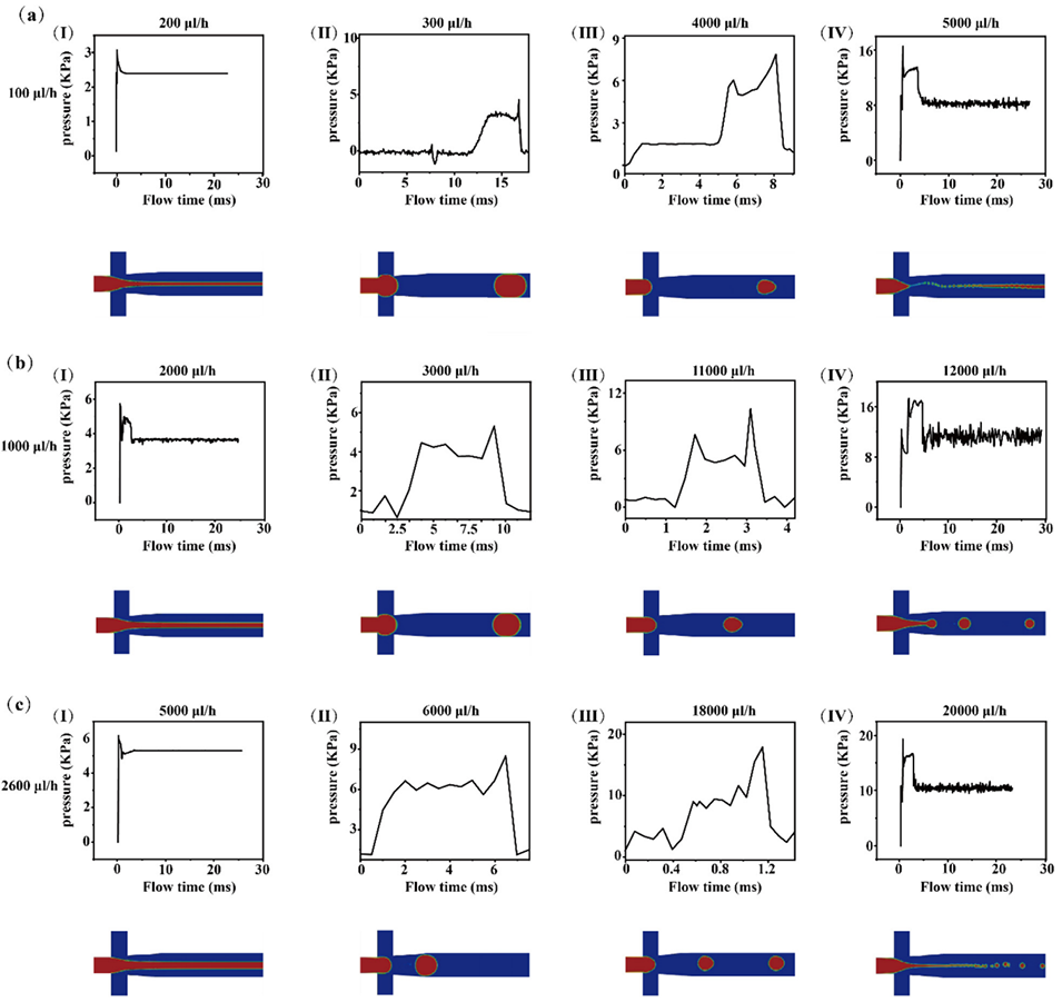 图8. d1=40 μm 时不同流动条件下的压力特征与液滴形态。(a-c)连续相流速对监测点 P 压力的影响,对应分散相流速分别为 100 μL/h、1000 μL/h、2600 μL/h。每个子图上方为监测点 P 的压力瞬态曲线,下方为对应操作条件下的液滴生成轮廓图。