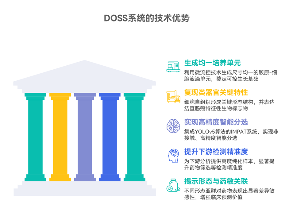 2、DOSS包含两个模块:CCO-D(结直肠癌类器官液滴)用于在基质中封装类器官以维持其形态多样性;IMPAT(图像引导多参数可调靶向)则通过机器学习实现基于形态特征的智能分选。