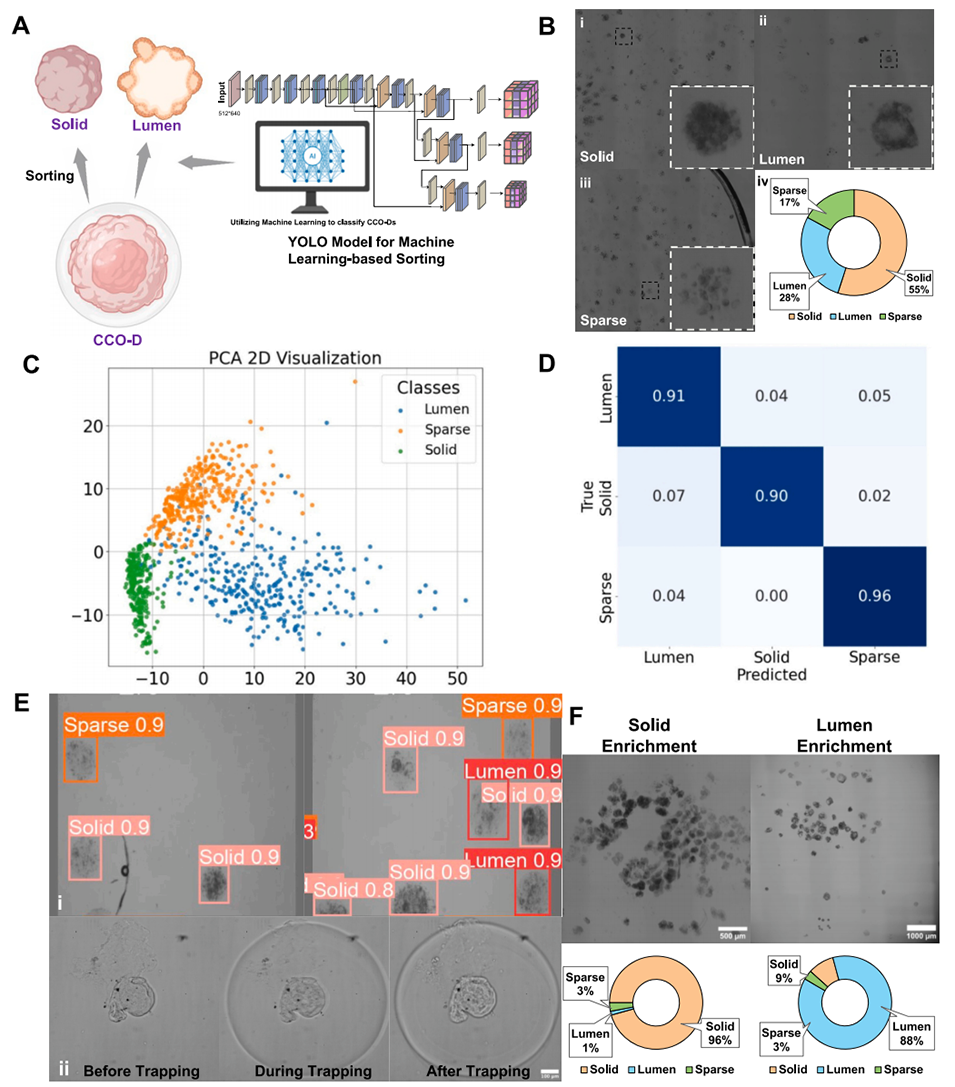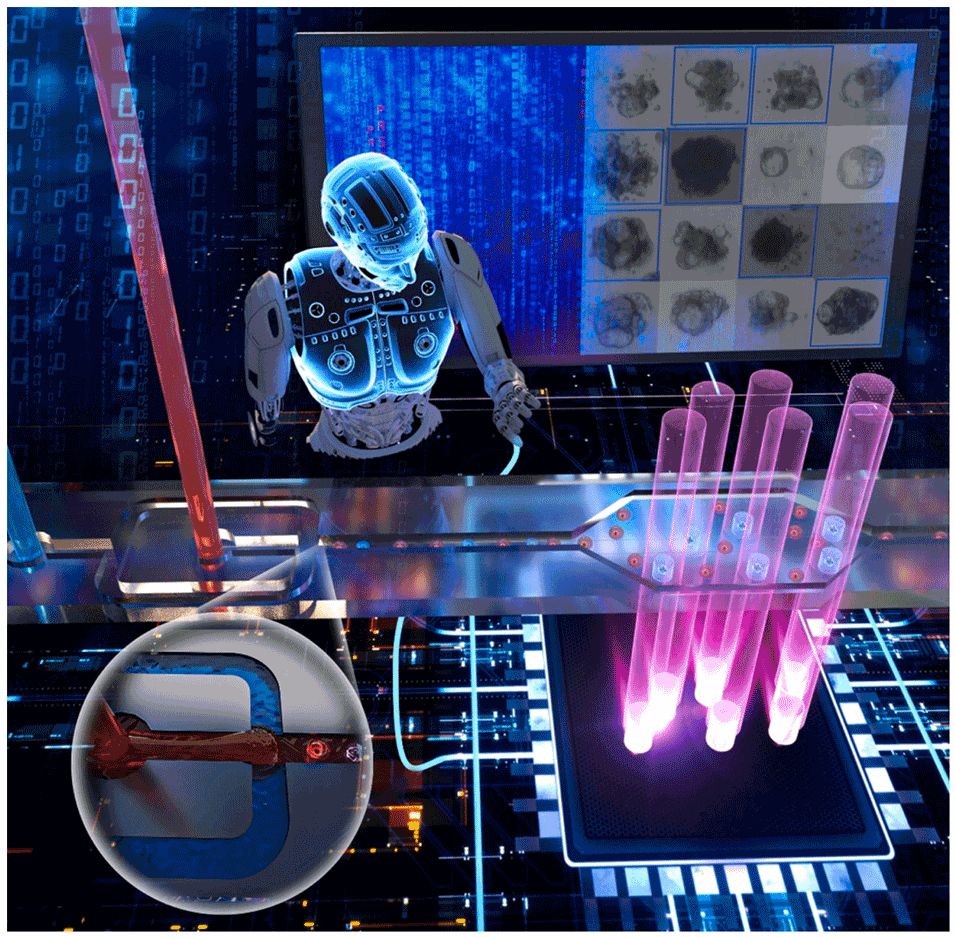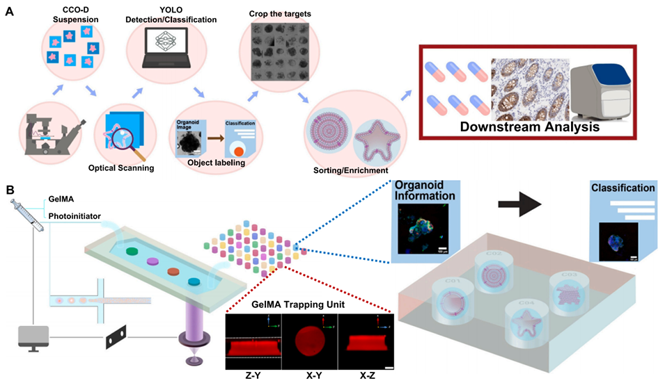 图1. 基于液滴的集成化类器官分选系统(DOSS)。该系统包含两个独立模块:(1)液滴-类器官生成模块;(2)基于机器学习的类器官分选模块。