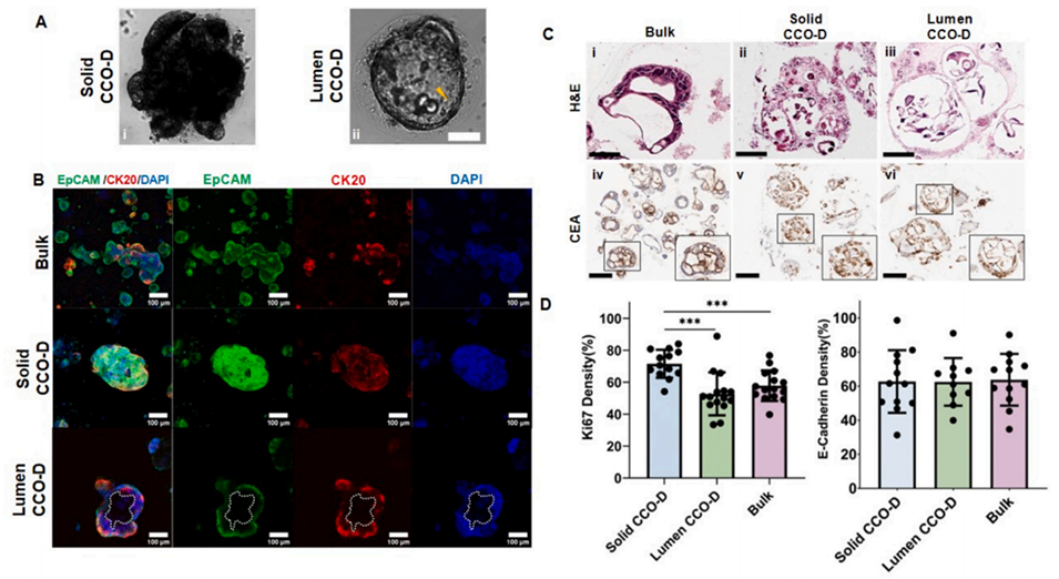 图4. 批量培养的结直肠癌类器官(CCO)与实质性、管腔性结直肠癌类器官-液滴单元(CCO-D)的表征