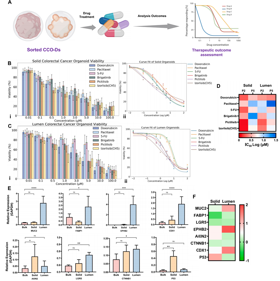 图7. CCO-D对抗肿瘤药物的存活率响应,及培养7天后批量培养CCO与实质性、管腔性CCO-D的PCR表达评估