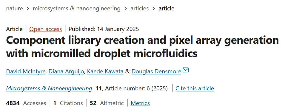 在此背景下,波士顿大学研究团队开发了一套基于桌面微铣削和导电墨水电极的低成本、快速原型化液滴微流控组件库,可实现液滴生成、再注入、锚定、皮升级注入、荧光传感和分选等功能,并通过组装这些组件构建液滴“像素”阵列,成功演示了复杂多步工作流程,为生物和化学领域的高通量筛选等应用提供了经济高效的解决方案。相关研究以“Component library creation and pixel array generation with micromilled droplet microfluidics”为题目,发表于期刊《Microsystems & Nanoengineering》。